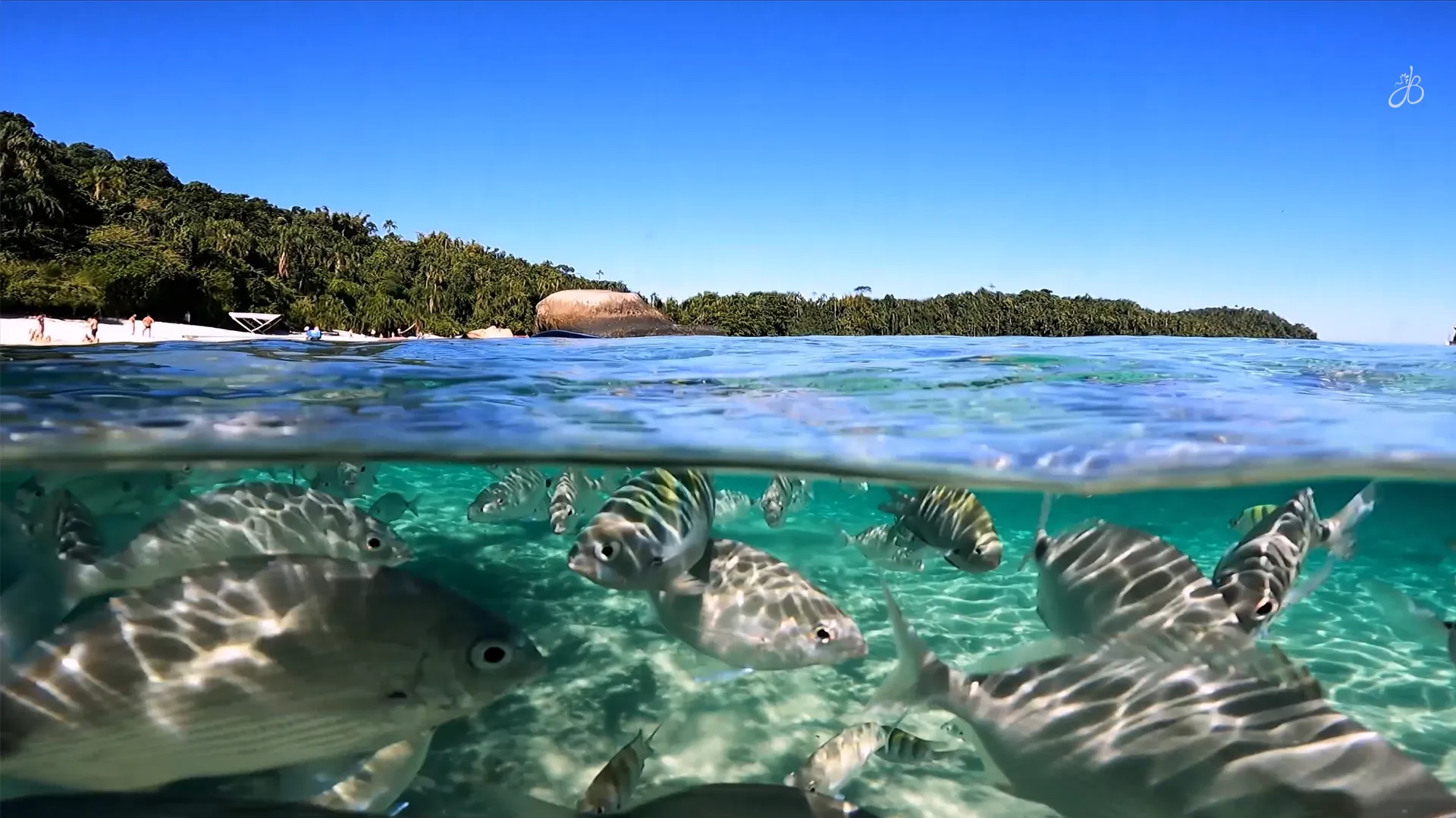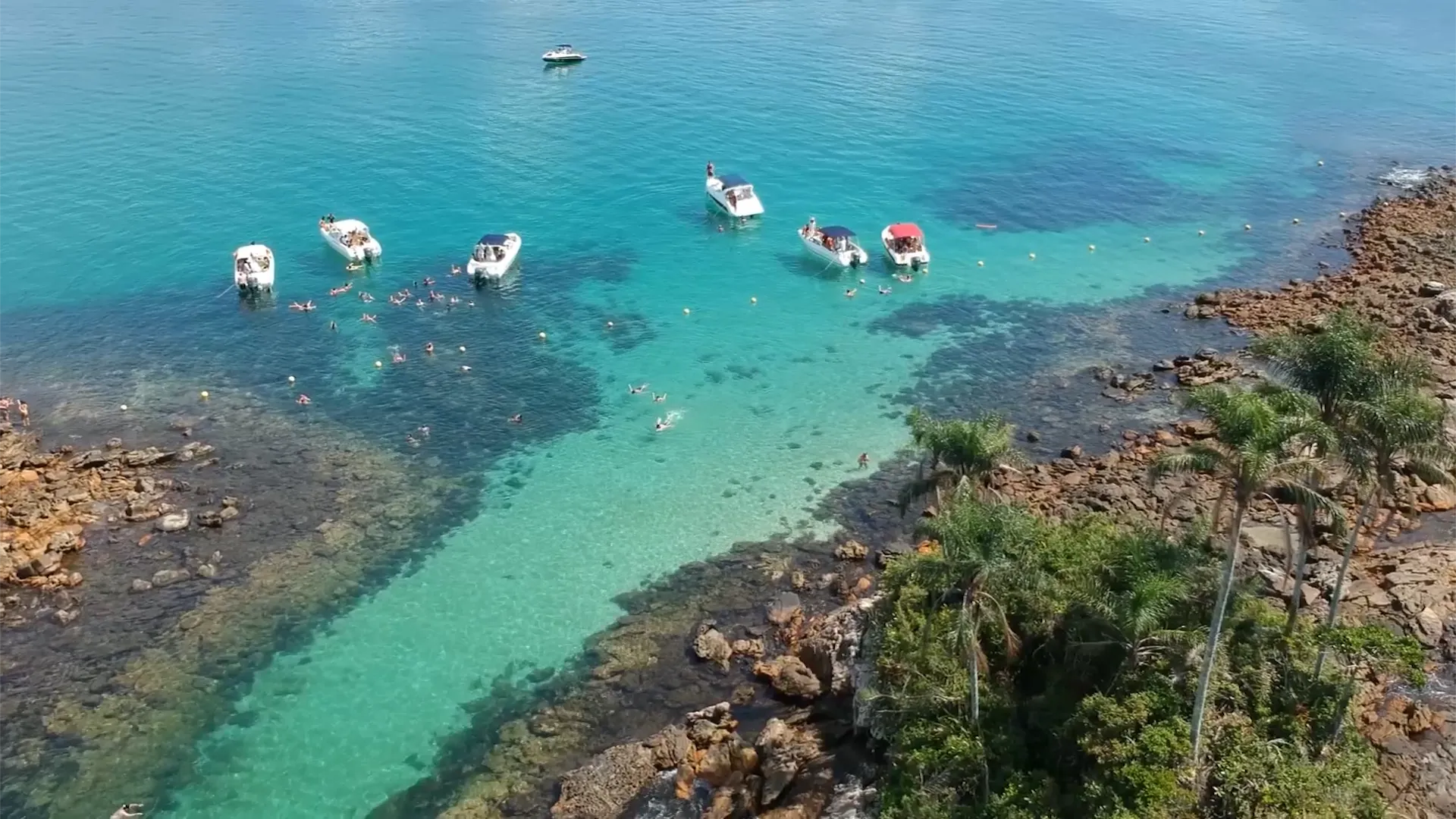 Mas o verdadeiro espetáculo está sob a superfície. A água aqui possui uma transparência tão surreal que o barco parece flutuar no ar. Este é o seu convite para o primeiro mergulho do dia! Ao entrar na água, você se torna parte de um aquário natural vibrante, cercado por cardumes de peixes coloridos, como os sargentinhos, que nadam curiosamente ao seu redor.