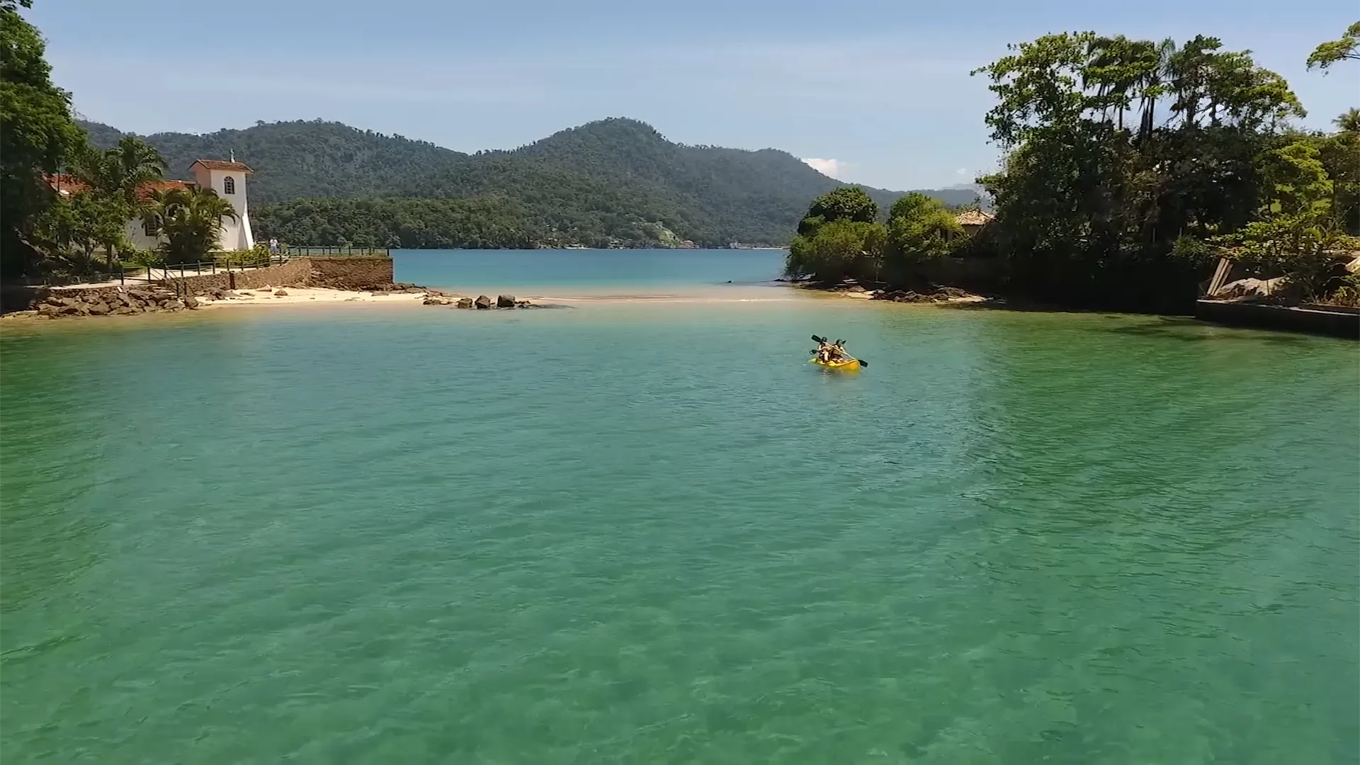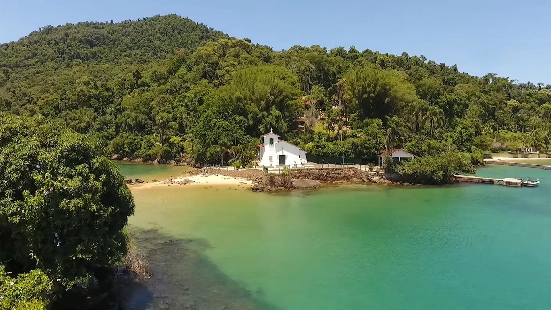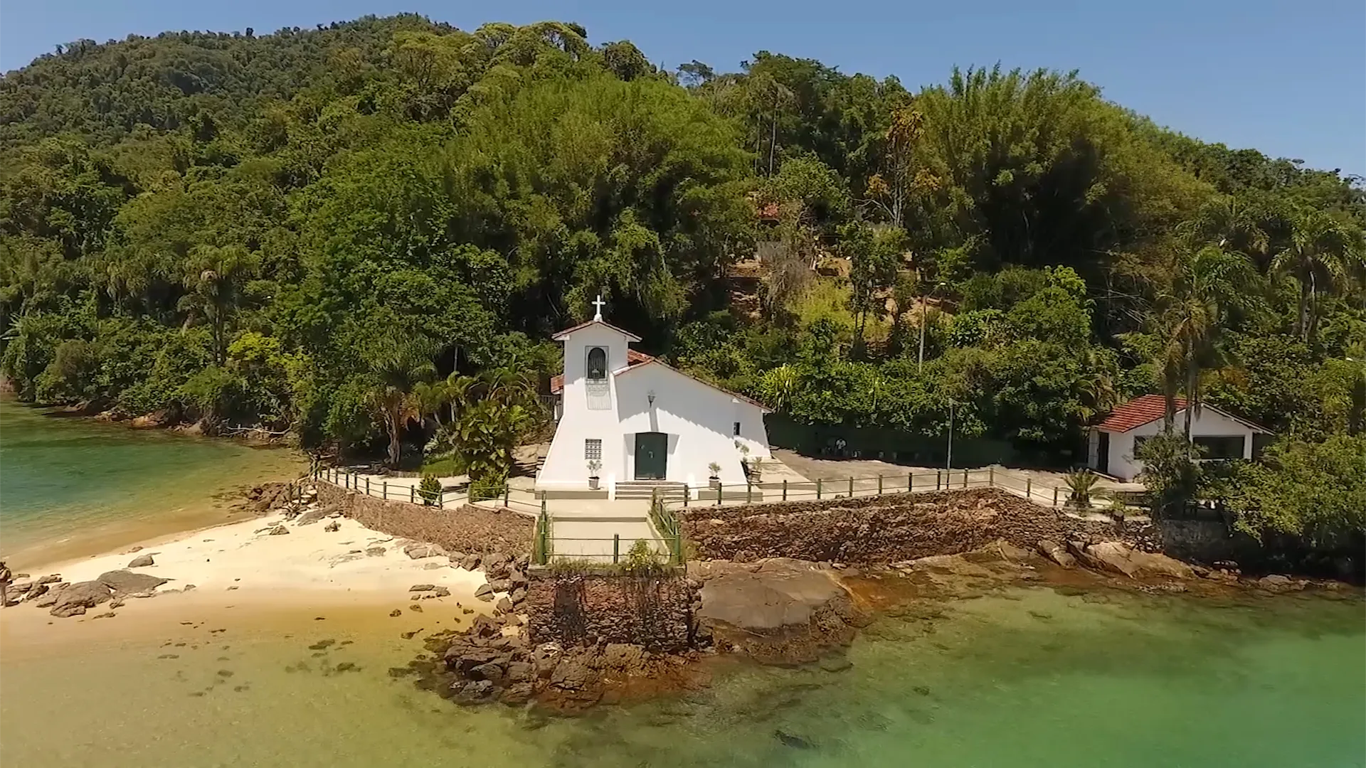 A primeira imagem é inesquecível: uma pequena e charmosa igreja branca no topo de uma colina, debruçada sobre um mar de águas serenas. A igrejinha é conectada à ilha principal por uma faixa de areia que, curiosamente, cria duas pequenas e tranquilas praias, uma de cada lado. É um lugar que acalma a alma instantaneamente, convidando para o último e mais sereno mergulho do dia.